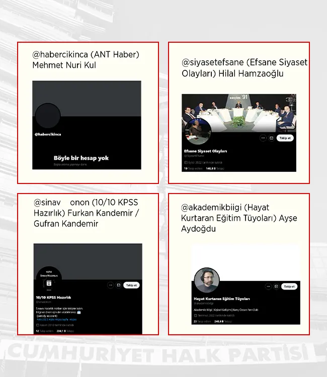 CHP’ye doğrudan bağlı olduğu iddia edilen 6 ağ, hem partinin propagandasını yapıyor hem de dezenformasyon üreterek vatandaşları algı operasyonuna düşürüyor. Hesap yöneticileri arasında çok sayıda FETÖ firarisi ve FETÖ ile iltisaklı olduğu tespit edilen şüpheli şahıslar yer alıyor.