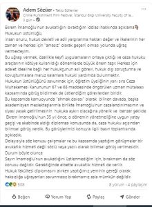 Sosyal medya sitesi Linkledinde kendi sayfasından İStanbul Bilgi Üniversitesi Ceza ve Ceza Muhakemesi Hukuku Ana Bilim Dalı Başkanı Av.Adem Sözüer yaptığı açıklamasında;” İmamoğlu’nun avukatlığını üstlenmediğim için, bırakmam da söz konusu değildir.” dedi.