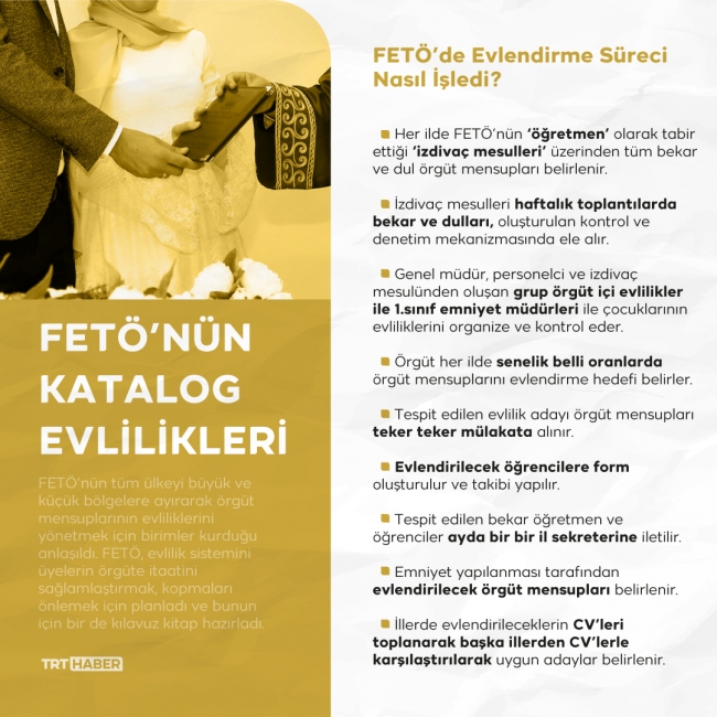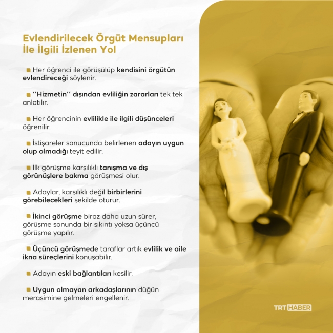 FETÖ’nün örgüt içi “evlilik” kitapçığı ile izdivaç sorumlularına verilen talimatnameler ele geçirildi. TRT Haber’in ulaştığı belgeler örgüt izdivaç sorumlularına “Hizmetin dışından biriyle evlenmek bizim ölümümüz demektir” talimatı vermiş.
