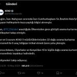 AFAD’dan yapılan açıklamada, “Bugün, İran-Nahçıvan sınırında İran Cumhurbaşkanı Sn.İbrahim Reisi’yi taşıyan helikopterin kaza yaptığı bilgisi alınmıştır. İran, @TC_Disisleri