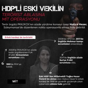 PKK/KCK’nın sözde yürütme konseyi üyesi Hatice Hezer, MİT’in Irak’ın kuzeyindeki Süleymaniye kentinde düzenlediği nokta operasyonla etkisiz hale getirildi.