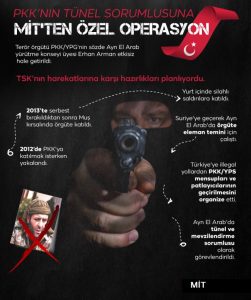 MİT, terör örgütü PKK/YPG’nin sözde Ayn El Arab yürütme konseyi üyesi Erhan Arman’ı düzenlediği özel operasyonla etkisiz hale getirdi. Arman, Ayn El Arab’da özel olarak tünel ve mevzilendirme sorumlusu olarak görevlendiriliyordu.