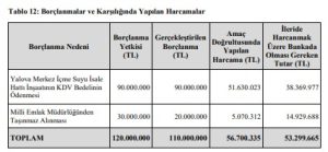 Yapılan incelemede, belediye meclisinin, belediye başkanına, Yalova Merkez İçme Suyu İsale Hattı İnşaatının KDV bedelinin ödenmesi için 90 milyon TL, Milli Emlak Müdürlüğünden Taşınmaz alınması için 30 milyon TL olmak üzere toplam 120 milyon TL borçlanma yetkisi verdiği, bu kapsamda detayı aşağıdaki tabloda görüleceği üzere 110 Milyon TL borçlanma yapıldığı görülmüştür. Borçlanma amacı çerçevesinde toplam 56.700.335 TL harcandığı, ancak borçlanılan amaç çerçevesinde devam etmekte olan ödemeler için kalması gereken 53.299.665 TL’nin banka hesaplarında bulunmadığı, idarenin diğer faaliyetleri doğrultusunda harcandığı tespit edilmiştir.