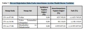 Tablo 7: Mevcut Değerinden Daha Fazla Amortisman Ayrılan Maddi Duran Varlıklar