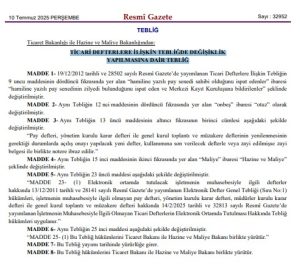 10 Temmuz 2025 tarihli ve 32952 sayılı Resmi Gazete’de yayımlanan değişiklik Tebliği ile 19/12/2012 tarihli ve 28502 sayılı Resmi Gazetede yayımlanan TİCARİ DEFTERLERE İLİŞKİN TEBLİĞ ’de aşağıdaki değişiklik yapıldı.