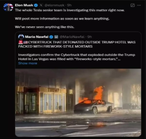 Yeni yılın ilk günü yerel saatle sabah 8.15 sularında Las Vegas’taki Trump otelinin önünde Tesla marka bir araç patlayarak yanmış, olayda araçta bulunan kişi hayatını kaybetmiş ve civardaki 7 kişi de hafif şekilde yaralanmıştı.